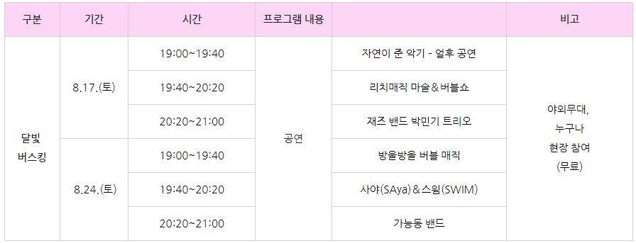 예를 들어 달빛 버스킹의 경우 8월 17일(토)과 24일(토)에 진행되며 19시부터 21시까지 공연이 진행되고, 야외무대로 현장에서 무료로 참여할 수 있으니 직접 가보는 것도 좋습니다.
