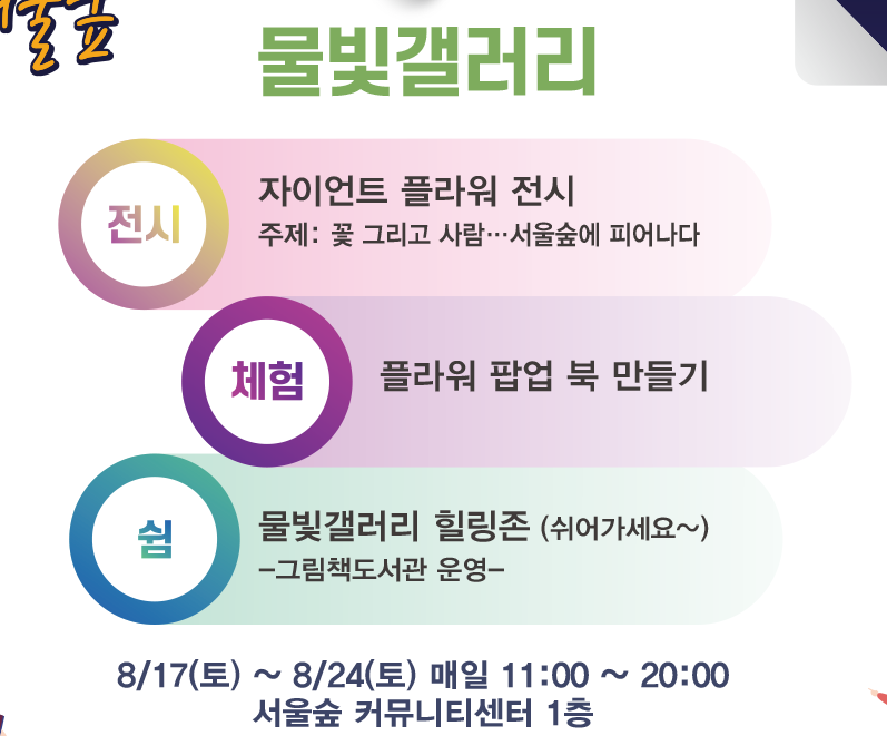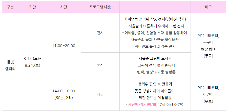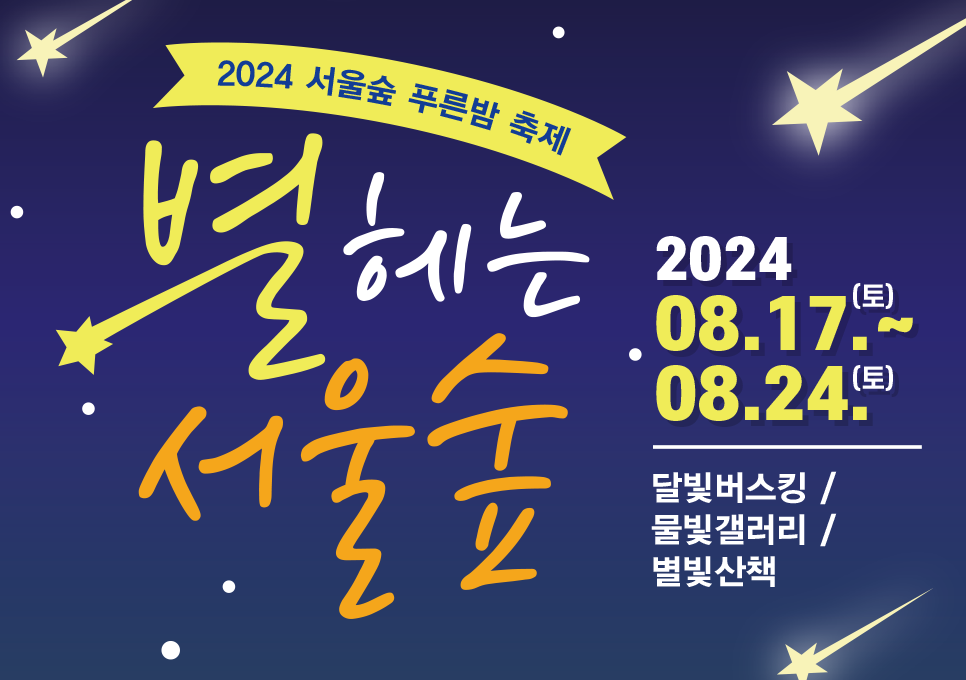 별 헤는 서울숲 행사는 각종 체험과 전시 프로그램 등을 진행하며 2024년 8월 17일(토)부터 24일(토)까지 참여할 수 있습니다.