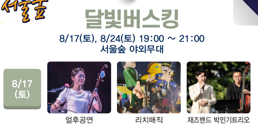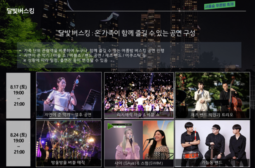 서울숲 푸른밤 축제에서는 다양한 프로그램이 준비되어 있으므로, 미리 어떤 프로그램에 참여할지 선택하는 것이 중요해요. 달빛버스킹에서는 매일 3팀의 공연이 준비되어 있어요.