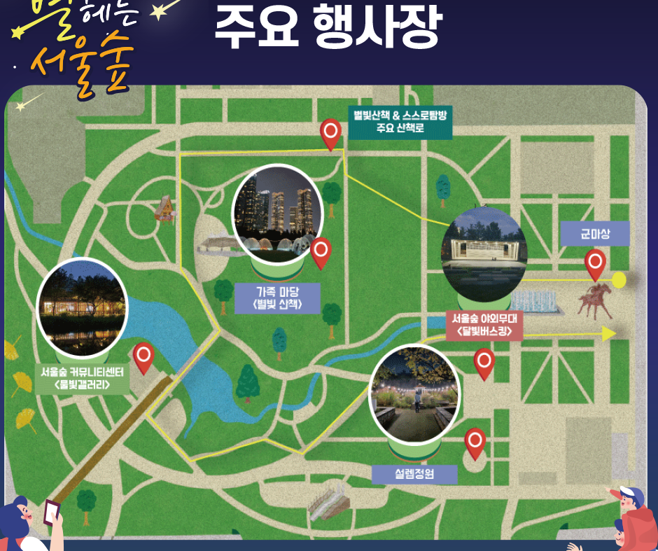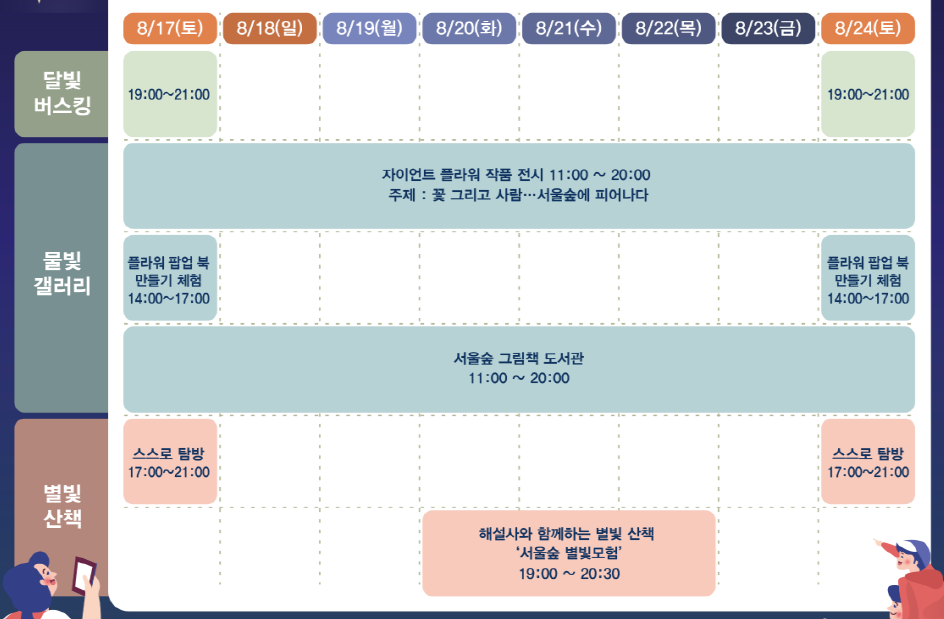 서울숲 야외무대에서 공연을 즐길 수 있는 달빛 버스킹, 각종 작품 등을 관람할 수 있는 물빛 갤러리, 숲 체험을 위주로 진행하는 별빛 산책의 3가지 테마를 즐길 수 있습니다.