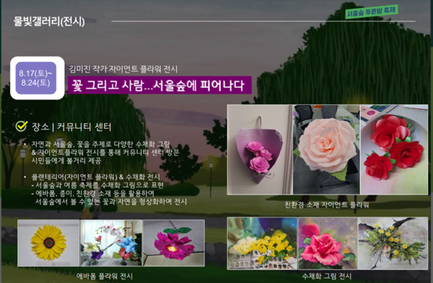 이 프로그램은 플랜테리어 작가와 함께 친환경 소재를 사용해 꽃을 형상화한 작품을 만드는 체험이에요. 아이들이 자연과 예술을 접하면서 창의력을 발휘할 수 있는 좋은 기회이기도 해요.