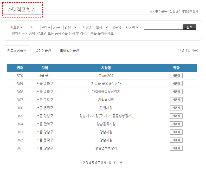 가맹점의 확인은 '전통시장 통통' 사이트에 접속하여, 가맹점포찾기를 통해서 지역별로 온누리상품권을 사용할 수 있는 시장 및 점포를 찾을 수 있습니다.