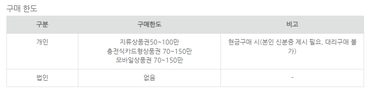 개인 고객의 경우, 지류상품권은 50만원에서 100만원까지, 충전식 카드형 및 모바일 상품권은 70만원에서 150만원까지 구매할 수 있어요.