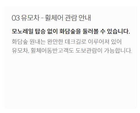 그리고 탑승 전에는 반드시 시간을 확인해보세요. 화담숲 모노레일은 정해진 시간에만 운영되기 때문에 예약한 시간에 맞춰 도착하지 않으면 탑승할 수 없어요.